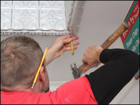 The washed white finish gave the tin ceiling the feeling it had been there a while (photo, above), though it added a couple of months to the lead time. We ordered a couple of extra panels and trim profiles as cheap insurance. The material costs were around $1,100, and it took about a day for me to install the tin.
