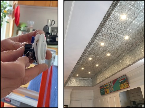 After finishing the tin installation, the lighting was installed to complete the tray ceiling. My electrical sub and I cut 2-1/8-inch-diameter holes for the dimmable 2-inch-diameter LED lights in place, avoiding lapped tin seams when locating them. The LED lights came with spring-loaded clips to hold them in place (above left). We installed the lighting in an offset pattern, supplying ample lighting to the kitchen’s “galley” area (above right).