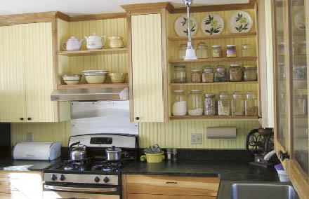 We also use a lot of open shelving in place of upper cabinets. Open shelves cost less than cabinet boxes, of course, and they’re easier to build on site. They also offer greater flexibility. They can be shallower, for instance, which opens up the counter space a bit, and they can be positioned lower on the wall.