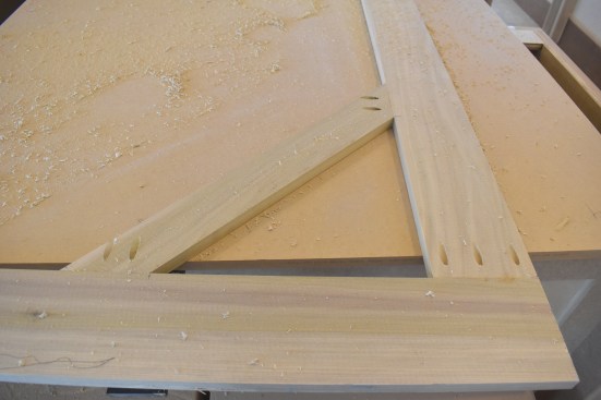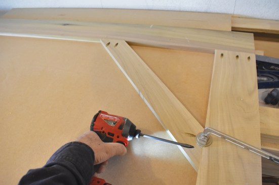 Adding the short diagonal rails at the corners was the last step to finish the frame. I laid them out for equal distance from the corners. Since the frame was not a perfect square, I scribe-fit the cuts. Even at off angles, pocket screws make great, snug joints.
