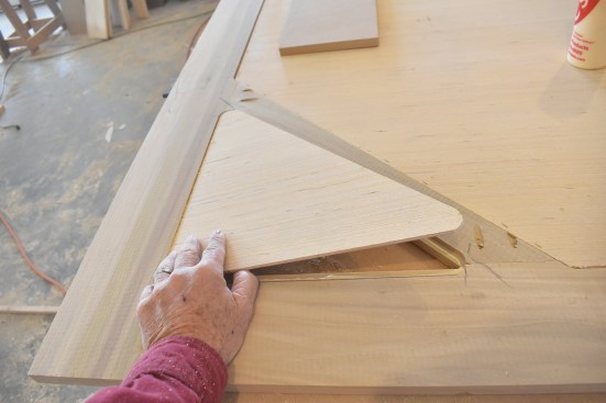 I cut the panels from a couple of sheets of 1/4-inch sanded birch plywood. The 1/2-inch width of the rabbet cuts allowed for a fair amount of forgiveness to cut the panels, but I did need to clip their corners to accommodate radius corners of the rabbet. That works well for 90-degree angles but not for the two acute angles at the corners of each triangular-shaped panel. I could have chiseled out a pocket for the plywood, but I tried using a belt sander to round the corners to fit. After a little practice, I decided this approach was much faster than the chisel option.