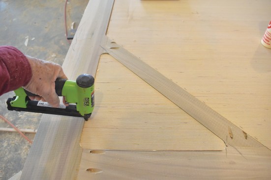 After test-fitting all of the panels, I fastened them to the frame with glue and short, 1/2-inch-long staples. For this task, I like to use wider, 7/16-inch or 1/2-inch crown staples (the kind that you might use to put up plastic or a vapor barrier) rather than narrower, 3/8-inch crown staples, which tend to bury themselves halfway through the thin plywood panels. In addition, the wider crown staples have more holding power.