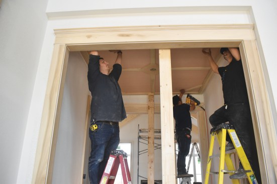 Since I wanted to take pictures of the installation process, I cut a couple of temporary 2×4 support legs to length to act as a fourth pair of hands and help the other three guys until they could shoot enough nails to attach the assembly to the ceiling. It took a few minutes to double-check the layout and make sure we centered up perfectly on the electrical box for the light fixture, so the 2×4 legs really came in handy. Afterward, we added trim-head screws at each fastener location for extra strength.