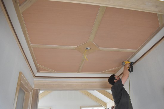 To finish up, we added the same cove-molding detail that we had used in the rest of the house. Our client was very happy with the result, especially after the paint crew had primed and painted the ceiling along with the trim work, and the electrician had wired up the ceiling fixture. The frame-and-panel detail creates a strong visual impression without being overly traditional in the most public area of the home.