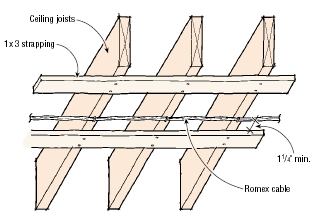 - Q. Here in New England, we usually attach 1×3 strapping to the ceiling joists before installing drywall. At most jobs, I see the electricians stapling the Romex cable to the bottom of the joists, parallel to the 1×3 strapping, so the wiring is about 1/2 inch or less from the back of the drywall. Does this meet the NEC, or does the wiring need to be recessed farther from the drywall?