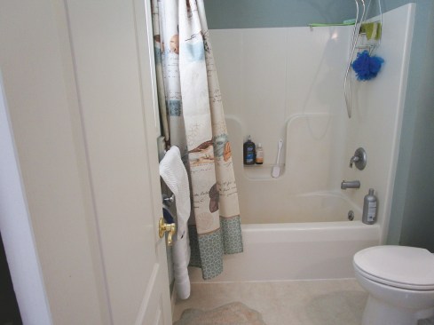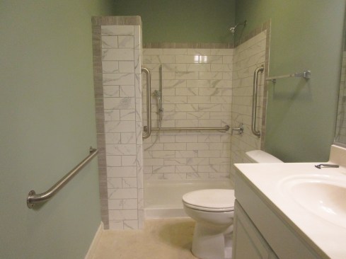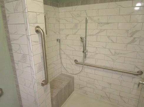 This bathroom doesn’t come close to meeting the ADA requirements for accessibility, which are written mainly for people in wheelchairs who are using public accommodations. While this bathroom is not accessible for an unaccompanied person in a wheelchair, it is much more accessible than it was before. My brother has been using it for a year and a half now and has told me that the modifications we made have worked extremely well. He particularly likes being able to bathe while seated using the handheld shower.