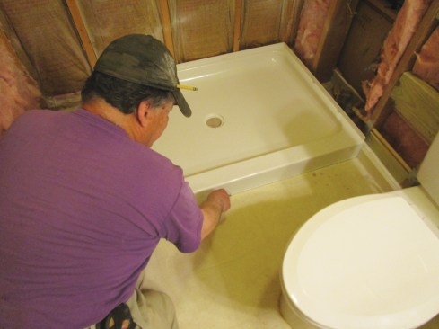 Next, The author installed the prefabricated shower base, using clips to hold it in place (above). The gap between the shower base and the wall will be filled with a custom bench seat (right).