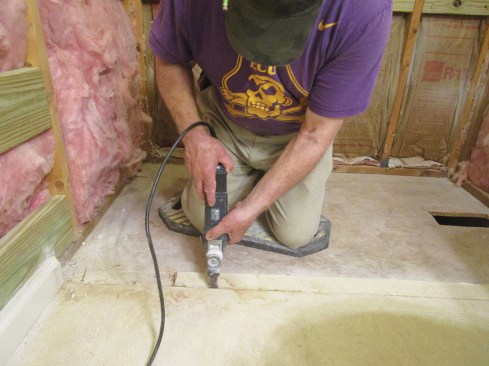 The author used a multi-tool to make the cut in the vinyl flooring and through the underlayment to expose the subfloor.