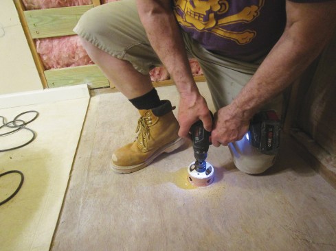 The new Vikrell shower base features a center drain. Here, the author is using a hole saw to make the cut for the drain line in the subfloor.