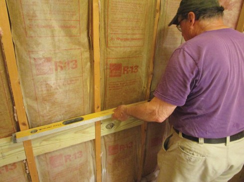 A good tile installation requires a very flat substrate, so before installing backer board, the author checked the wall framing with a level to see if the studs were in plane.