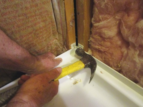I used the base itself to lay out the cuts for the drain and the vinyl flooring and underlayment, since the tub was 30 inches wide and the shower base was 34 inches wide. I also had to cut an additional 7 inches or so where I would build the short wall at the end of the shower. After I cut the floor covering and the hole for the drain, I checked the wall framing with a level to make sure the studs were straight. Before installing the shower base, I planed off the bow from a few studs, then used roofing nails to attach the clips that held the base in place.