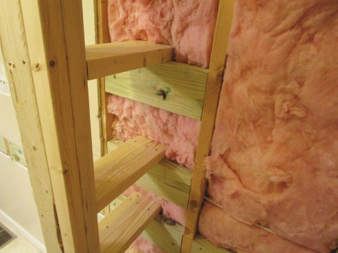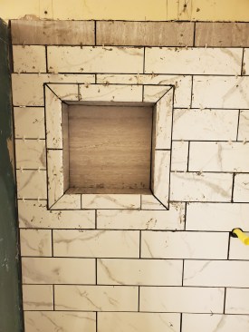 On the wall above the bench, I framed a niche, which consisted of two 2x4s screwed horizontally in the bay between two of the studs and one 2×4 installed vertically to make it 12 inches square. As a result, the niche is not perfectly centered on the wall, but centering it would have involved reframing the entire wall and considerable drywall repair.