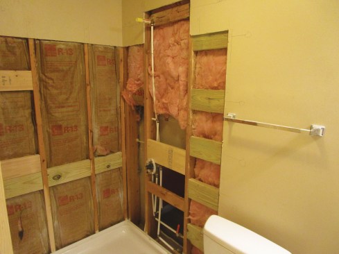 After cutting up and removing the existing fiberglass tub, the author cut back drywall and installed blocking for new grab bars.