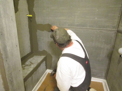 Tile backer board. After testing the plumbing lines for leaks, I installed Permabase, a cement-based tile backer board, on the walls and the bench. Then, following the manufacturer’s directions, I covered the seams using modified thinset and 2-inch alkali-resistant mesh tape. I also covered the screws with the thinset. This process is similar to taping drywall, and I used my 6-inch taping knife to apply the thinset and embed the tape.
