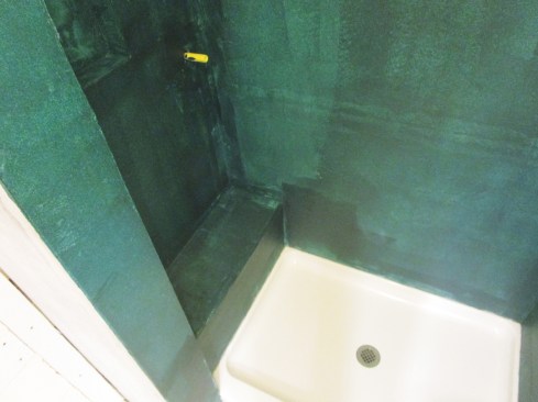 Waterproofing membrane. We chose Mapei Mapelastic AquaDefense liquid-applied membrane to waterproof the shower. This membrane is easy to install; you just paint it on with a roller or brush. The key thing to remember is that it’s water-soluble, so it’s essential to apply it to a dry surface. I let the thinset dry overnight before applying the first coat of Aqua Defense, then let that coat dry overnight before I applied the second coat.