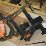 I used a Jorgensen “mini-precision” miter saw mounted on a 45-degree angle block. The saw is small and inexpensive (about $20) and has a short stroke. It’s not a pro-grade tool, but its small size worked well for this jig. I cut all the left-hand miters at once, then reset the miter saw on the opposite angle to make all the right-hand cuts.