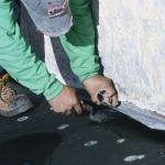 Once the existing roof has been torn off, we have to do some structural work. At a minimum, we have to ensure that the roof sheathing nailing schedule complies with the new, tougher codes. To resist the uplift force of hurricane winds, sheathing has to be nailed with 8-penny ring-shank nails at 6 inches on-center in the field and 4 inches on the perimeter. We use nail guns to drive the nails and have a second worker follow with a hammer to drive the heads flush to the plywood as needed. Otherwise, protruding nail heads will make holes in the tar paper. We also replace any rotted sheathing with sound plywood.