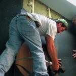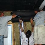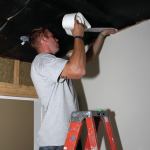 Applying a 130-pound roll of Sound Barrier is heavy work for the crew. Obviously it’s even more work to roll it out across a ceiling (see photo) than onto the wall. We’ve been working on various rigs and jigs to solve this problem, but usually it just calls for muscle—at least three men to get a roll nailed into position. We secure the material to studs or joists with wide-head roofing nails, using a roofing nailer.