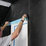 Once the Sound Barrier is up, the crew can cut around wall receptacles or light fixtures with a drywall knife and tape the membrane to electrical boxes. Another critical step is sealing the electrical boxes with mass-loaded soundproofing putty. Otherwise, sound will infiltrate the room through air holes in the boxes.