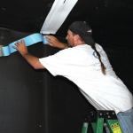 On ceilings, we’re not always confident that the adhesive of the seam-sealing tape will hold and that the tape won’t tear. So we’ve developed a tougher cord-reinforced tape, which we apply over the top of the standard Sound Barrier tape. We had to work with the tape’s manufacturer and try several different pressure-sensitive-adhesive (PSA) formulas before we found a PSA that would reliably stick to the Sound Barrier. The product we finally settled on comes to us in 4-foot rolls that we cut into a 5-inch or 6-inch width for use on the job (we also distribute this tape along with the rest of our soundproofing products).