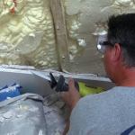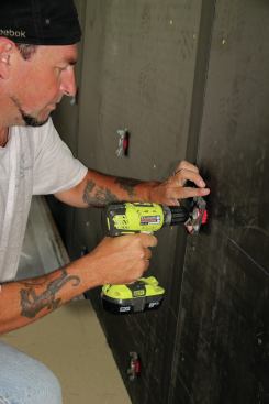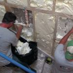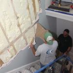 Because it was a retrofit, we started with demolition. The crew tore off the existing drywall by hand, making occasional cuts with a recip saw. The existing drywall was tight to the skirtboard running along the wall, and there was no space available for building out the wall with clips and channel, as previously described. This meant we had to tear out the existing spray foam insulation by hand, taking care not to damage existing plumbing or wiring in the wall. We replaced the foam insulation with special acoustic rock wool fiber batts. (We don’t have an official sound-abatement contribution for either open-cell or closed-cell plastic foam insulation, but experience tells us that the relatively dense foam increases sound transmission through walls.)