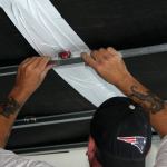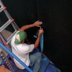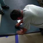 It’s important to tape all the joints in the Sound Barrier to prevent sound from bypassing it. We seal every seam, typically using a special tape made of the same MLV material with a blue release paper. All seams—including seams between sheets in the field, at the edges, and in corners—must be tightly sealed.