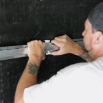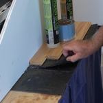 Once the wall was stripped and de-nailed, we applied our Sound Barrier material, carefully fitting it around any complicated shapes, such as the ceiling beams and other bump-outs. At 1 or 2 psf, the mass-loaded vinyl is heavy, taking a lot of effort to apply, particularly when it needs to be carefully fitted. On the other hand, the material cuts easily with a drywall knife, making it simple to shape.