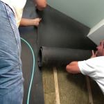 If the floor is carpeted, we can install a special soundproofing carpet pad. This quiets the sound of footsteps on the floor, of people dropping things, and the like. The pad has a top surface of Sound Barrier and a sponge-like bottom layer. The Sound Barrier absorbs the sound of voices or other airborne noise in the room and blocks the sound waves from traveling into the floor. But the Sound Barrier also soaks up the energy of footsteps or other floor impacts, and the sponge layer further disperses the impact energy. The composite carpet pad also suppresses noise that originates downstairs and prevents the sound energy from entering the upstairs room.