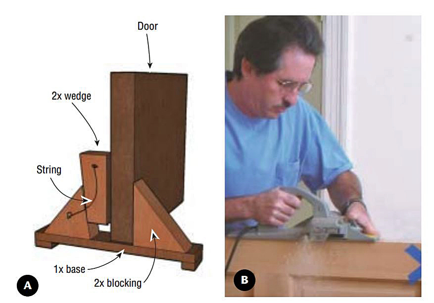 First, put together a good door bench or a door stand. You can cobble a stand together from some scraps of 2-by and 1-by (photo A below), or you can make a full-blown bench. I’d suggest making the bench. A good door bench has a lot of uses. The legs fold up, so the bench is easy to store and transport, and once you start hanging doors, you’ll never stop — there’s good money in it. (See “Hanging a New Door in an Old Jamb,” 8/99, for more on building a door bench.)
