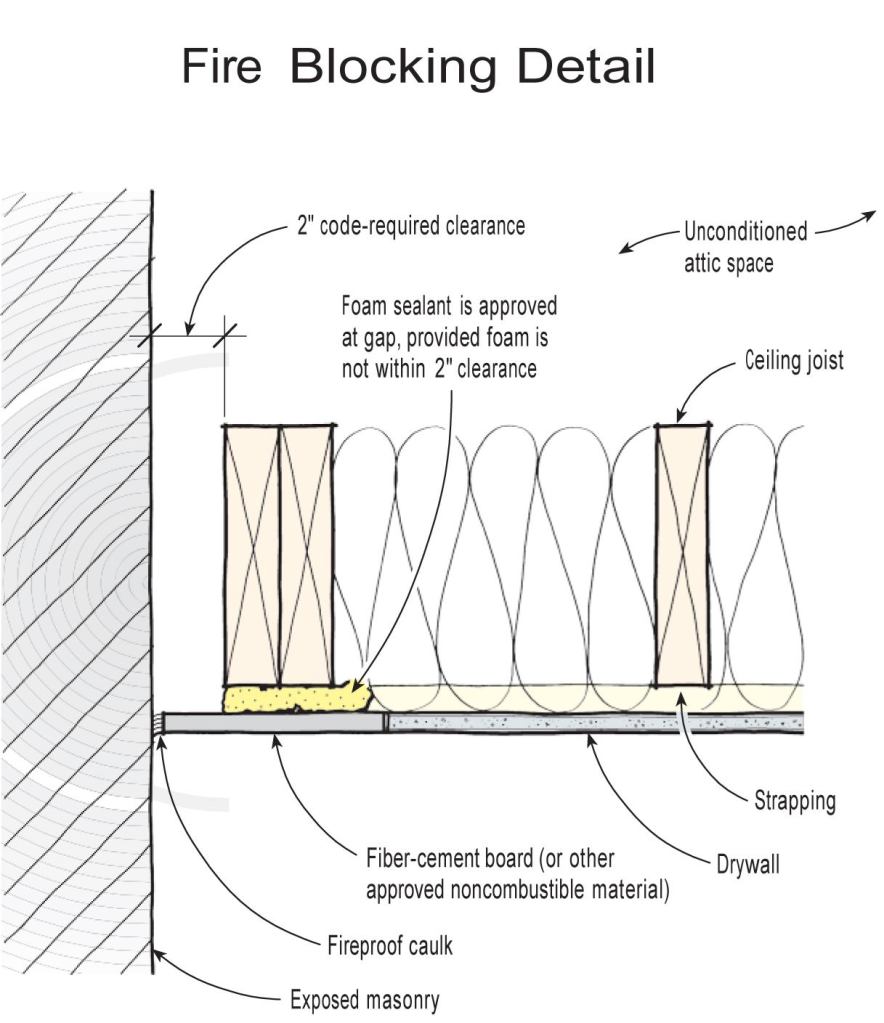 When the chimney is exposed, an alternative is to cut back the ceiling drywall and patch in strips of noncombustible cement board, butting them to the masonry and sealing the gap with fireproof caulk (see illustration, left). Fire blocking is required at each level, at either the top or bottom of the joists, whereas draft-stopping is important primarily at insulated ceilings and floors that are part of the home’s thermal boundary.