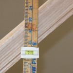 To use the gauge, I place the base strip across the tread nosings and raise the yardstick until the bubble reads plumb. I then tighten the knob; the square block prevents the T-nut from spinning, which allows me to tighten the knob with one hand. Always read the gauge on the higher side by sighting across the top of the rail.