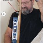 I drill a 5/16-inch-diameter hole through the reducer and tubing, grind the area flat around the hole, and then solder a 1/4-inch brass nut in place so that it is centered over the hole. This nut receives a 1/4-inch-diameter wing screw for locking the upper, extendable pipe in place (C). A common steel shelf standard glued to the 3/4-inch pipe with JB Weld allows me to attach a magnetic torpedo level.