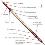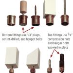 To increase its versatility, I designed the ends of the projector to accept interchangeable fittings (D). On top I transition with a reducer that goes from 1/2-inch IPS (so that the 1/2-inch pipe will fit inside it) to a 1/4-inch O.D. compression fitting. After soldering the fitting in place, I remove the compression nut and sleeve, then glue a 1/4-inch hanger bolt into the nut. To do this I put a dab of JB Weld inside the compression sleeve, insert the hanger bolt as if it were 1/4-inch tubing, put both into the fitting, and tighten the compression nut. Once the glue sets up, I remove the nut – hanger bolt, sleeve, and all – from the fitting and clean up any squeeze-out. The wood-screw end of the hanger bolt is now perfectly centered in the nut, giving me an attachment point for square or angled wood blocks; or I can simply use the pointed end. I make up several of these compression nut-hanger bolt units for a variety of end fittings.