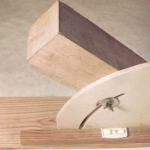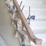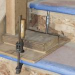 This is about as basic as it gets – a scrap of plywood with a small triangular block attached (A) that allows me to clamp the rail against the noses of the treads (B) while I test-fit easings and locate newels. A 1 1/2-inch hole bored through the block accommodates the short bar clamp that holds the rail snug.