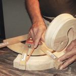 My shoe is laminated from several pieces of 1/2-inch birch plywood with a 9 1/2-inch radius cut out of them with a router and trammel (B). I make the blanks slightly long. After gluing the stack together, I set the shoe on the miter saw and trim it at the 90-degree tangent point. Then, when the easing is in the shoe and the miter saw blade is registered against the tangent point, the resulting cut will be perfectly perpendicular.