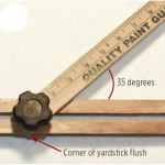 The hole at the bottom of the yardstick should be drilled so that its bottom corner is flush with the bottom of the plywood strip (C) when the gauge is open to approximately 35 degrees (the pitch of a 7-over-10 stair). Finally, to make sure the yardstick is plumb when I take my measurements, I epoxy a bubble level at about the 30-inch mark (D), clamping the stick along the edge of a post I know to be plumb and using the bubble for reference as I do the gluing.