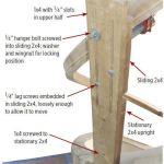 The base of my rail jack is a length of 2×6 attached to a 10-inch-by-14-inch scrap of 1/2-inch plywood. The upright is a 37-inch-long 1×4 screwed to a 22 1/2-inch-long 2×4 (A). A pair of slots cut into the upper half of the 1×4 allow a second 2×4, 9 1/2 inches long, to slide up and down on three screws (B). Two of the screws are 1/4-inch lags, driven through the slot into the 2×4; the third one is a 1/4-inch hanger bolt with a larger washer and wingnut for locking the rail height in place.