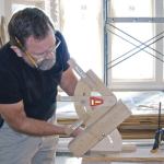 The cutting board is made from a scrap of plywood measuring about 10 inches by 48 inches, with two 1×2 rails set at 90 degrees along the edge. I transfer the projector’s length to the baluster with a combination square, then make my cut on the long side of the line so that the baluster will be exactly the same length as the baluster projector.