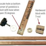 When it’s time to position the handrail at a uniform height above the tread nosings, my rail-height gauge is much easier to use and more accurate than a tape measure (A). The gauge, which works like an oversized T-bevel, consists of a wood measuring stick (my original one uses a yardstick) fastened to a 36-inch-long strip of 1/2-inch-thick plywood about 1 1/2 inches wide. The plywood strip has a 1/4-inch slot ripped exactly down the middle so that accurate readings can be taken regardless of which way the yardstick is swiveled. The two pieces are joined together with a plastic star knob with a 1/4-inch-diameter stud, a couple of brass washers, and a T-nut sunk into a hardwood block (B).