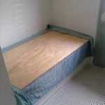 Bathtubs also need protection. If you just use plastic sheeting or even a moving blanket, it will sag and fall into the tub. I like to tape a moving blanket around the edge of the tub and drape it down the side, then cut a piece of 5/8-inch plywood to fit tightly over the blanket. Quarter-inch lauan won’t support the weight of the first guy who sits or stands on it.