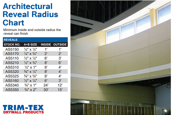 A second advantage that flexibility offers is the ability to easily bend vinyl reveal bead to fit around curves. Arched or curved designs no longer need to be finished with costly custom aluminum reveals that require long lead times. The most important step to curving Reveal Beads is getting an accurate measurement. To make sure you get the right reveal for the job, measure the radius of the curve and then refer to the chart found above or on the Trim-Tex website.