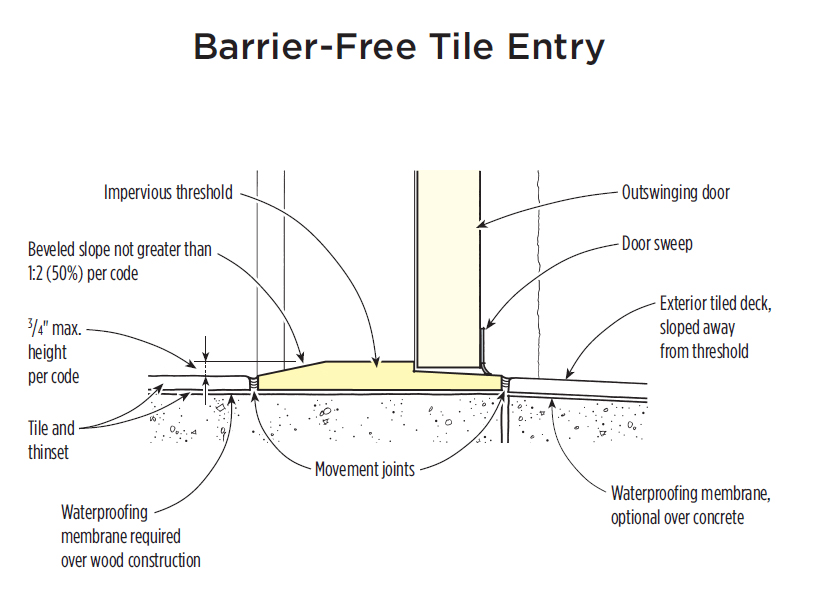 For a true barrier-free installation in a dry climate, I eliminate the threshold completely and separate the interior and exterior tiles with a movement joint at the doorway. In wetter climates, or if the deck is regularly exposed to wind and stormy weather, I use a stepped threshold to better resist leaks (see illustration). I typically have these thresholds fabricated out of a durable impervious stone, like granite, in a profile that provides weather resistance while meeting code requirements.The exterior waterproofing should be joined to the threshold with an appropriate long-life sealant. Water will still occasionally get past the threshold, but this shouldn’t be a problem if the interior floor is covered with tiles installed over a waterproofing membrane.