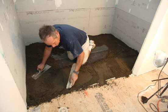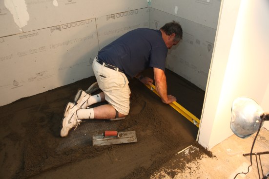 I created the sloped floor of the shower with a layer of dry-pack mortar (four parts sand to one part portland cement with just enough water so that the mix compacts in my hand). After dumping a few buckets of mortar in the shower, I began packing an even layer over the floor.