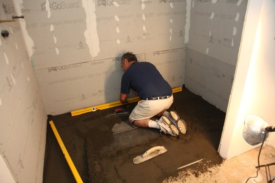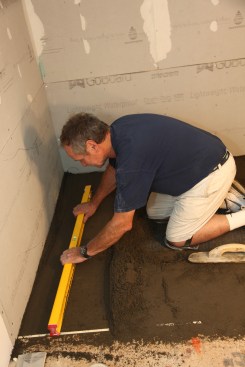 The fourth and final wall came next, sloping back up to the level of the threshold. With the screed guides established on all four sides, I was ready to install the drain and do my final screeding.