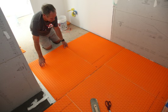 The clients asked for a heated floor in the main bathroom as well as in the shower, so I continued the heat membrane from the shower into the bathroom. The second course of membrane bridged the shower entrance into the main room.