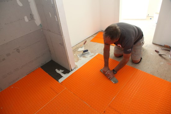 As with the other areas, going over the membrane with a wooden float is very important. I continued installing the Ditra Heat membrane throughout the rest of the bathroom.