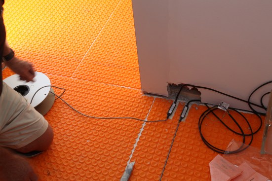 The first line traveled down to the shower. I try to keep the runs of wire at least three lugs from one another. The second run went down to the entrance to the shower and then filled in the rest of the bathroom floor over to the door.