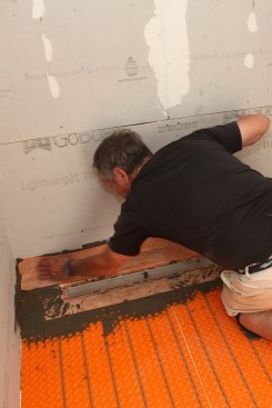Next I spread thinset in back of the drain on top of the drain membrane and up onto the waterproof wall board about 6 inches.