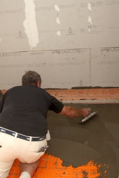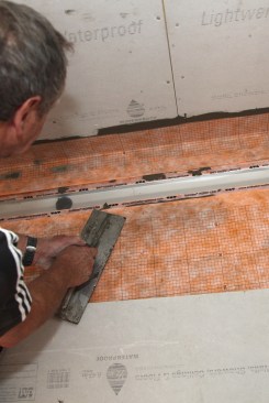 As with other areas of the floor, I worked the excess mortar over to the edges of the membrane and squeezed it out so that it could be removed.