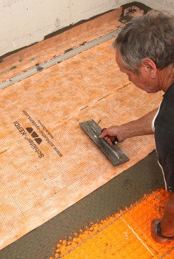 I pressed a full-width sheet of membrane into thinset, this time smoothing and pressing it down with a large flat steel trowel.